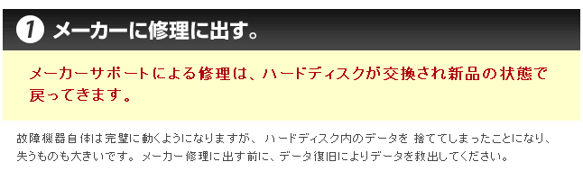 故障機器自体は完璧に動くようになりますが、 ハードディスク内のデータを 捨ててしまったことになり、失うものも大きいです。 メーカー修理に出す前に、データ復旧によりデータを救出してください。